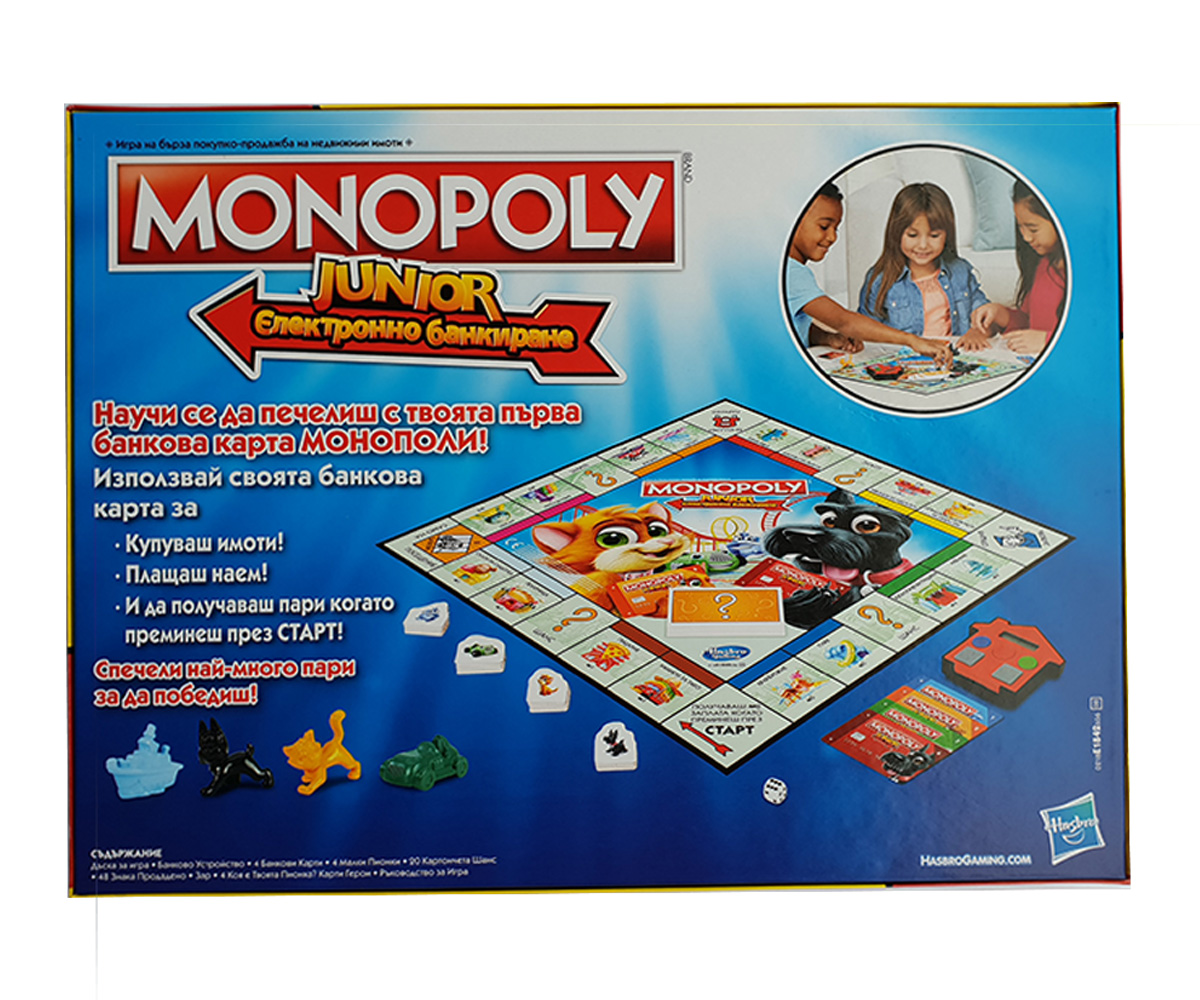 Добре дошли в света на Монополи Джуниър! Парите вече са в банкови карти в новата игра Monopoly Junior - Електронно банкиране. Плати с банкова карта като използваш новата технология. Препоръчителна възраст: От 5 до 10 години Производител: Hasbro