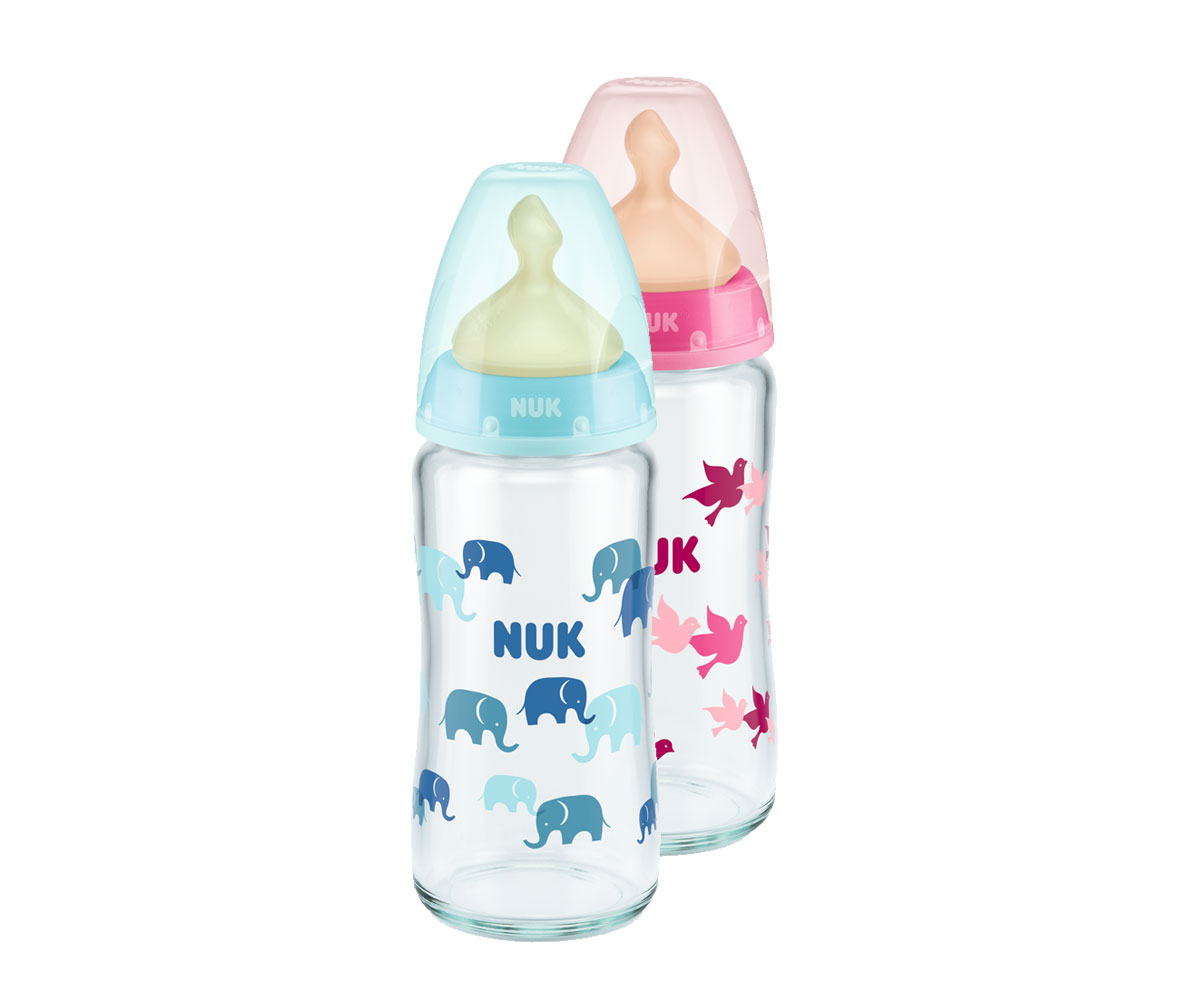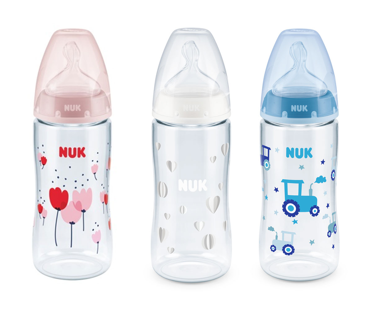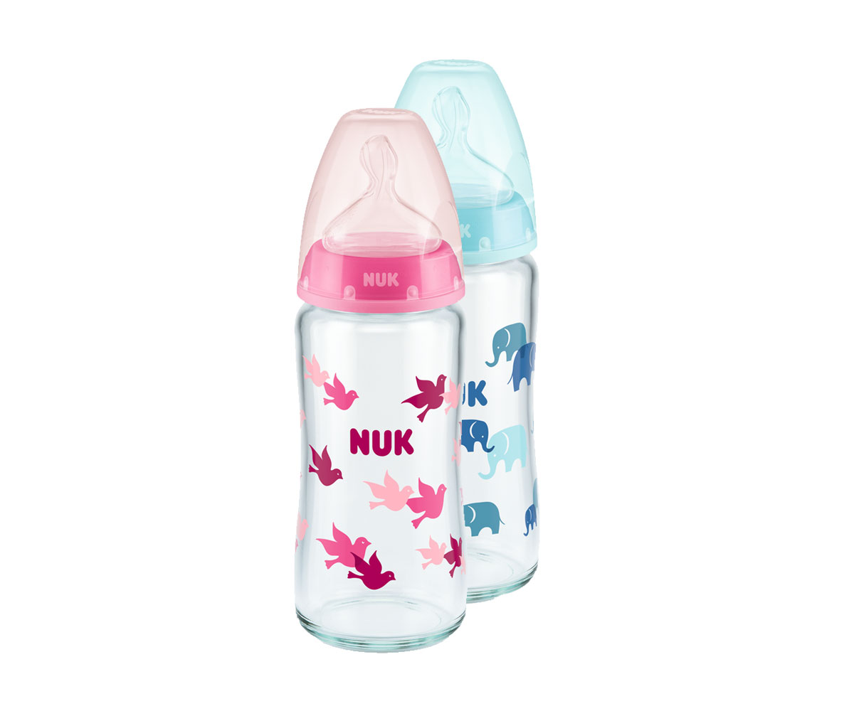 Стартов комплект стъклени шишета Nuk Termo Control First Choice, силикон, 2х240мл, 2х120мл и кошница, 0-6м