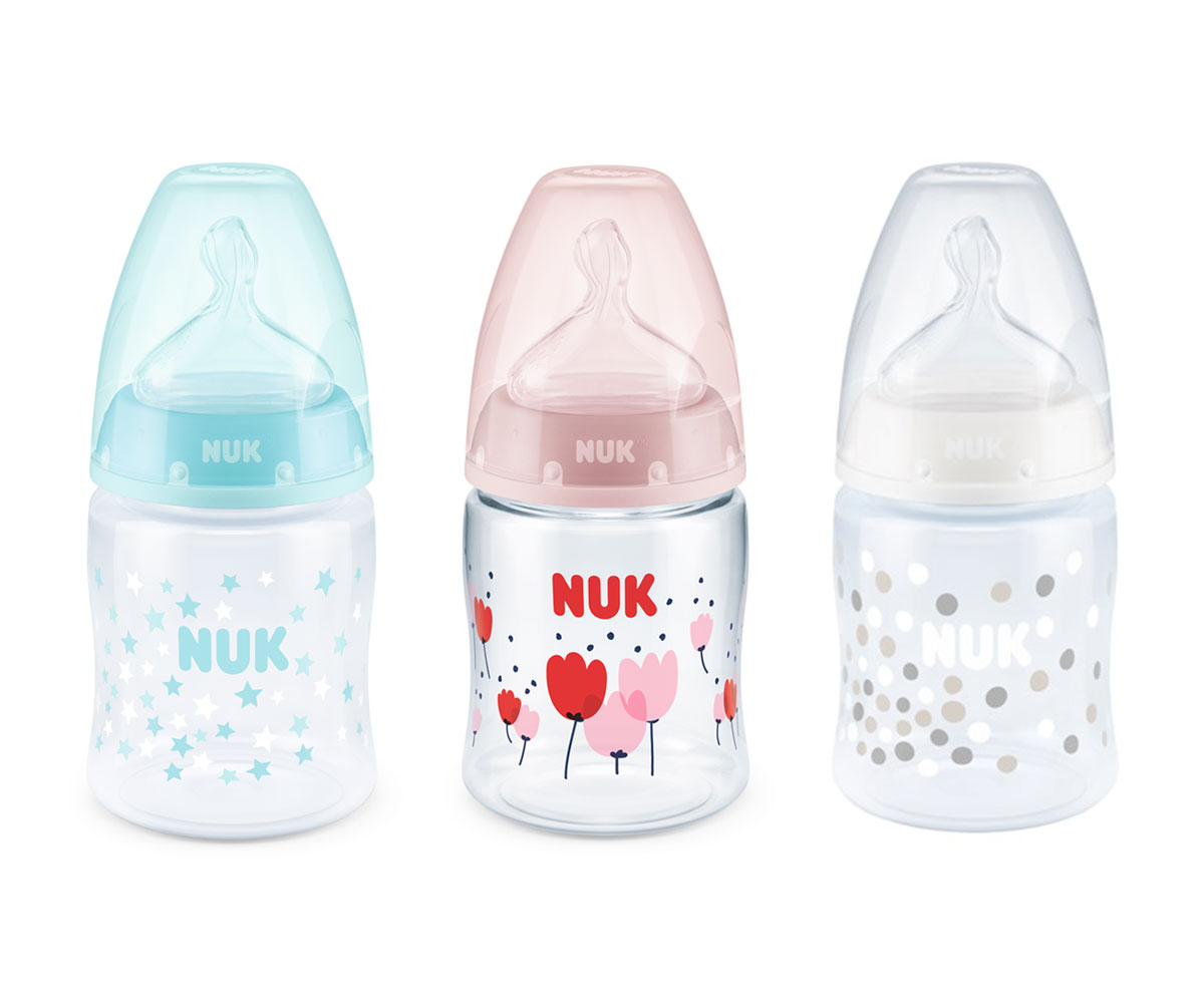 Бебешко стъклено шише Nuk First Choice Temperature Control, 120мл, силикон, 0-6м, асортимент
