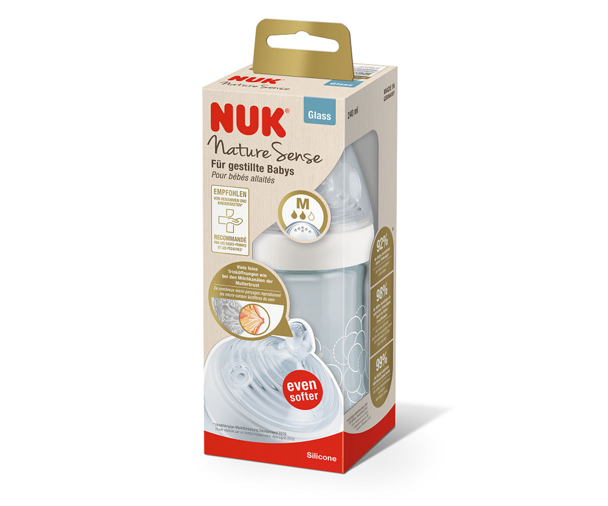 Бебешко стъклено шише Nuk Termo Control Nature Sense, 240мл, силикон, М softer, 0-6м, асортимент