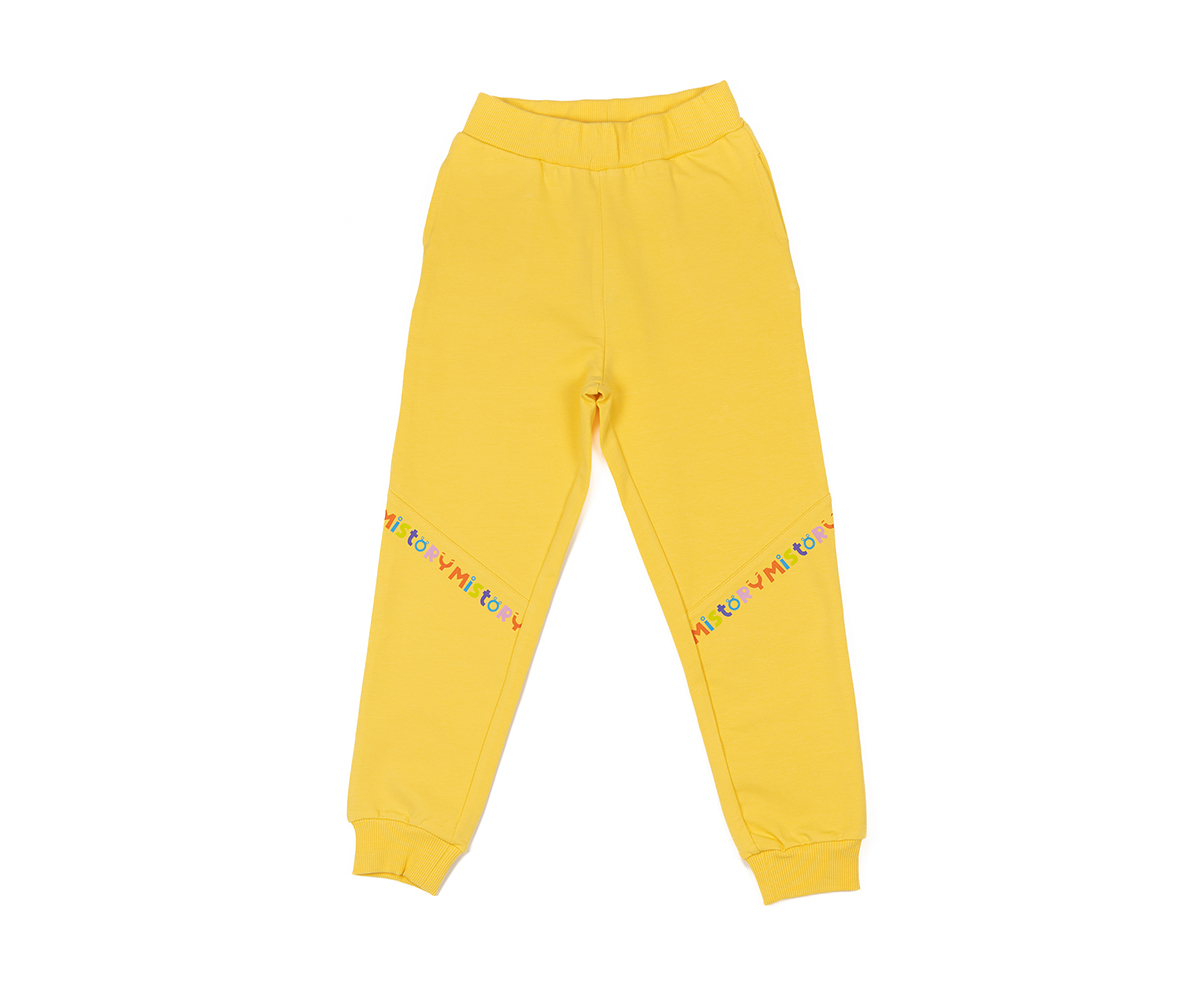 MiStory-Спортно долнище с щампи MiStory, ръст 140 см (овърсайз), 10 г., жълто