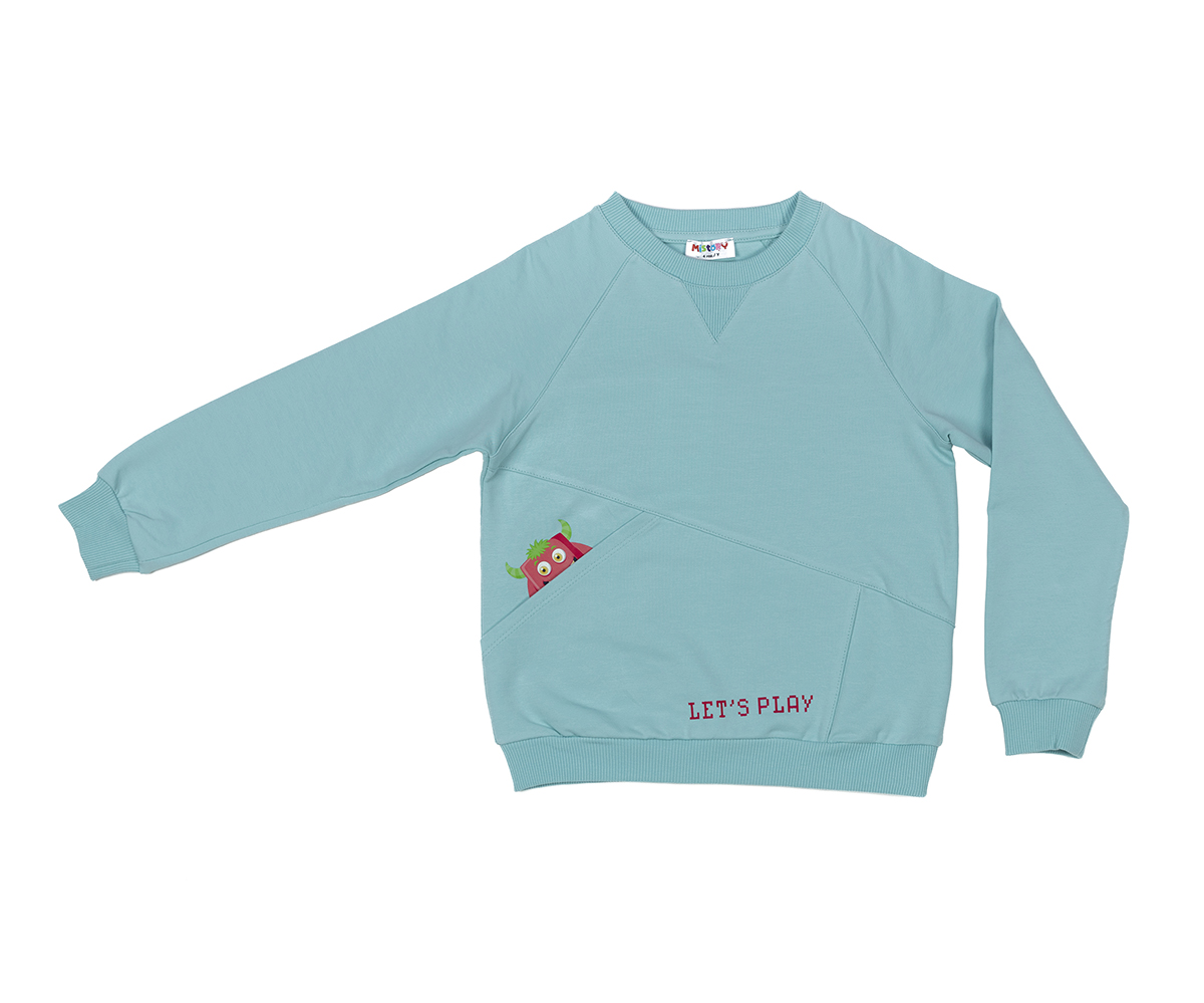 MiStory-Суитшърт с принт и джоб, ръст 152 см (овърсайз), 3-12 г., син