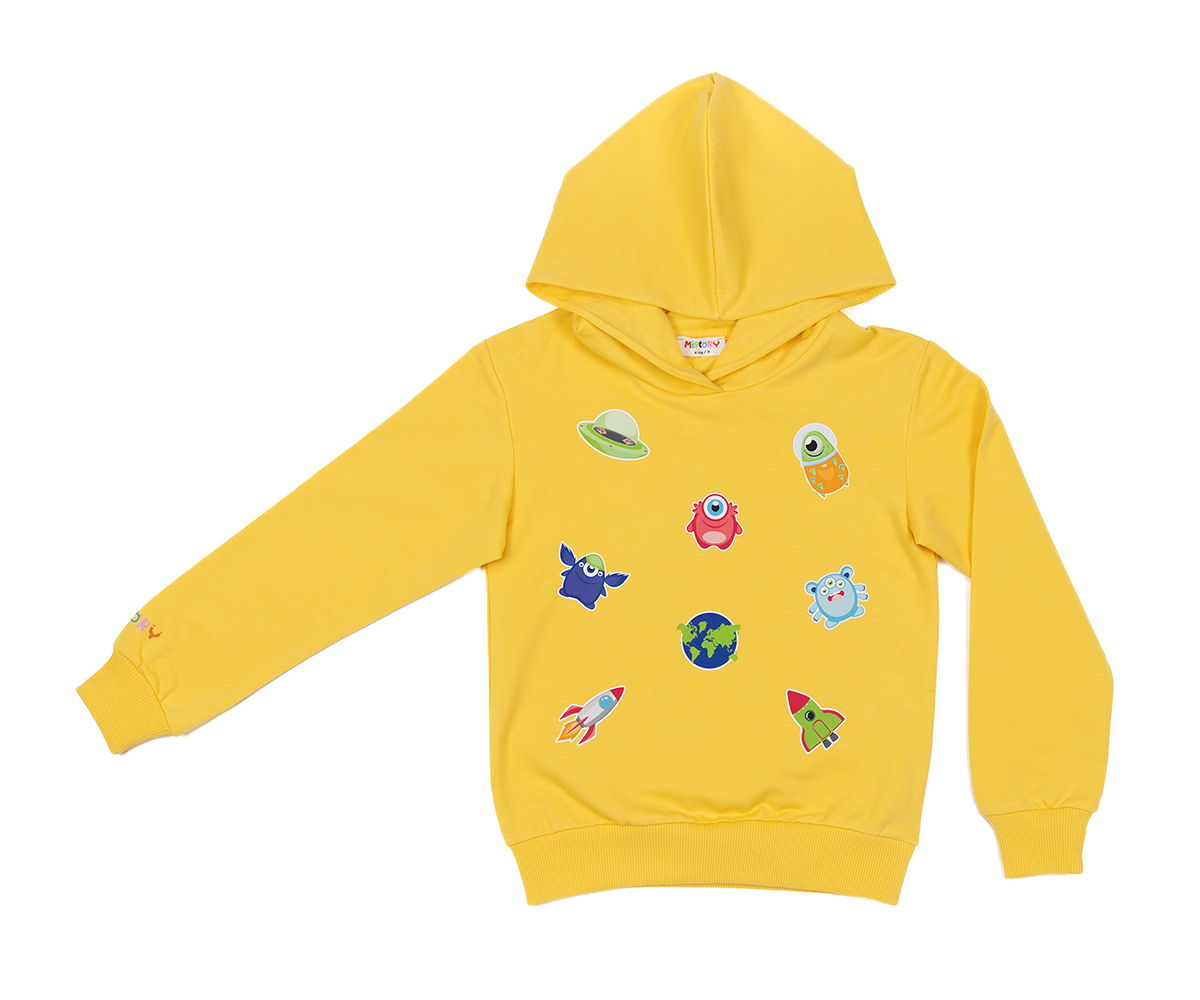 MiStory-Суитшърт с щампи и качулка, ръст 110 см (овърсайз), 5 г., жълт