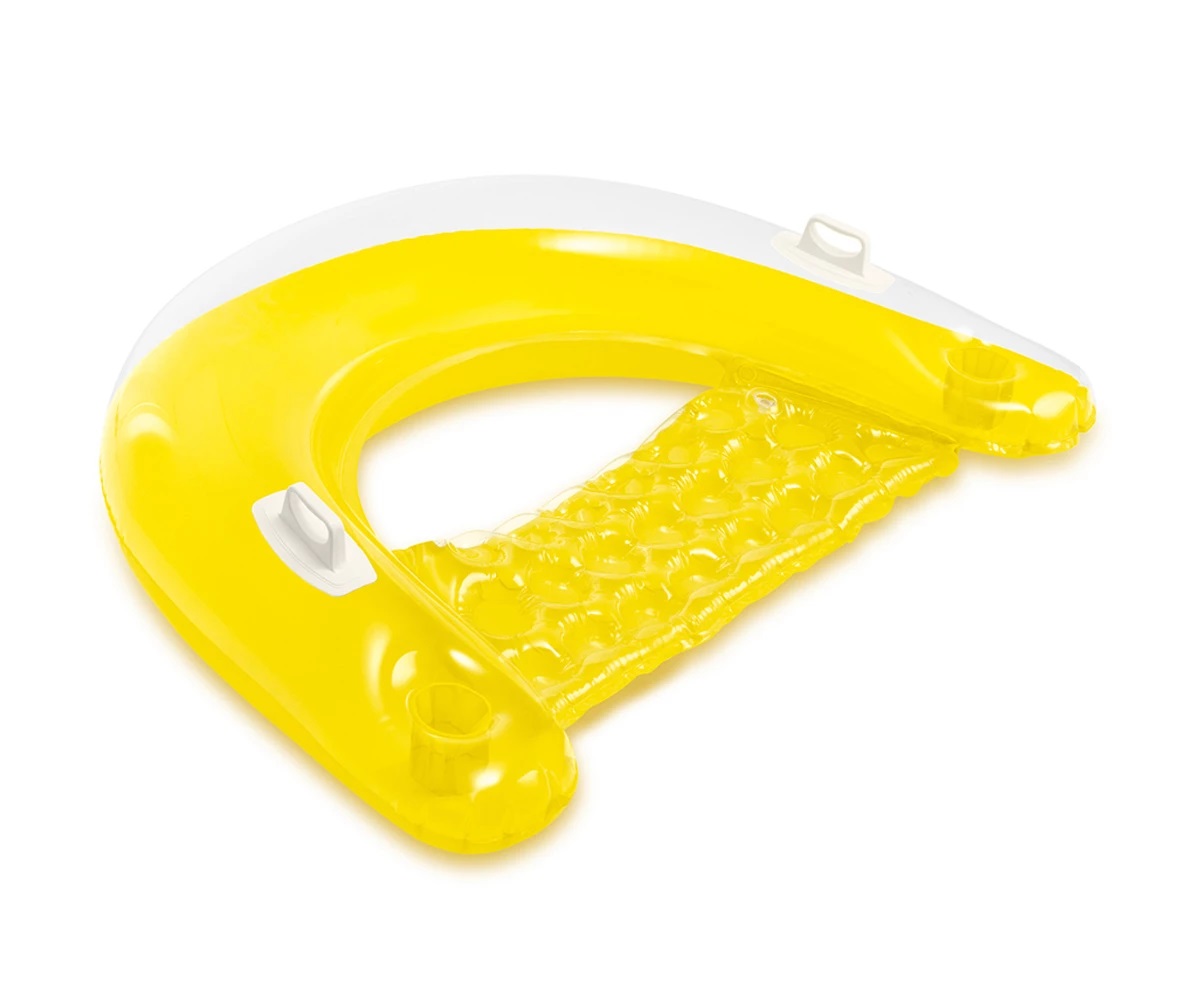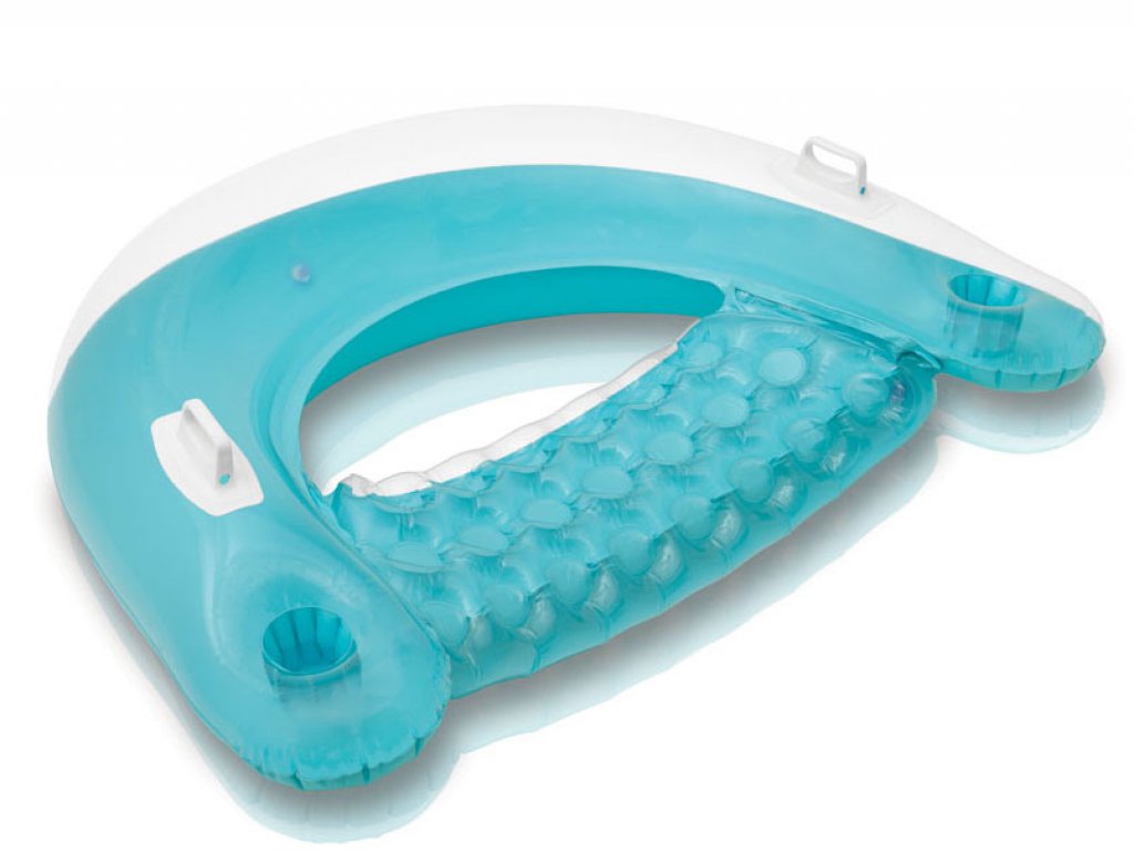 Надуваемият шезлонг Sit 'N Float на Intex е с уникален дизайн с прозрачен горен слой, има две ръкохватки, както и 2 джобчета, в които можете да поставите своята разхладителна напитка или слънцезащитен лосион.