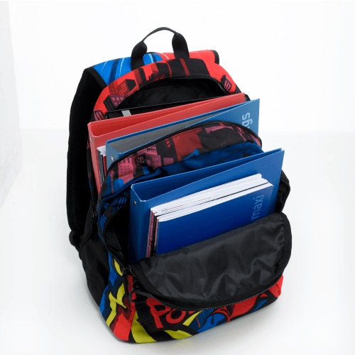 Характеристики: Тип: Plus Серия: Superhero Отделения: две отделения (11 см + 9 см) Джобове: два странични джоба от неопрен Ултра лека раница Изработена от водоустойчив материал. Гърбът и основата са подплатени с EVA, за да поддържат цялата тежест и да успокоят ударите, дори когато детето бяга. Раменните презрамки са широки и меки в гъвкав пенопласт, а формата се адаптира към ширината на раменете Раницата се предлага с ПОДАРЪК 2 бр. неонови глитери за украсяване на раницата. Размери: 41 х 31 х 20 см Тегло: 0.650 кг Капацитет до 25 л