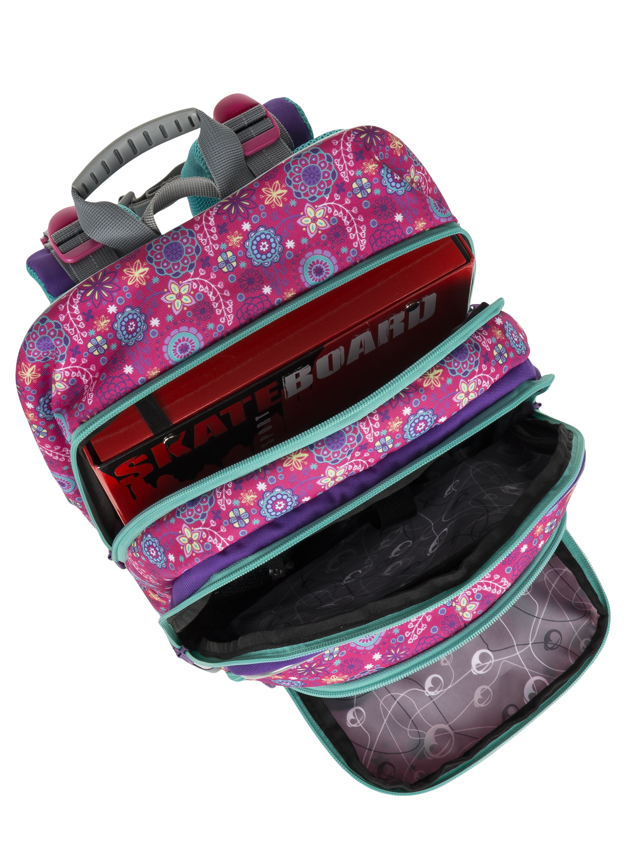 Във вътрешната част на едното основно отделение има джоб, в който е поставена подвижна лека алуминиева рамка, която предпазва децата от гръбначни изкривявания