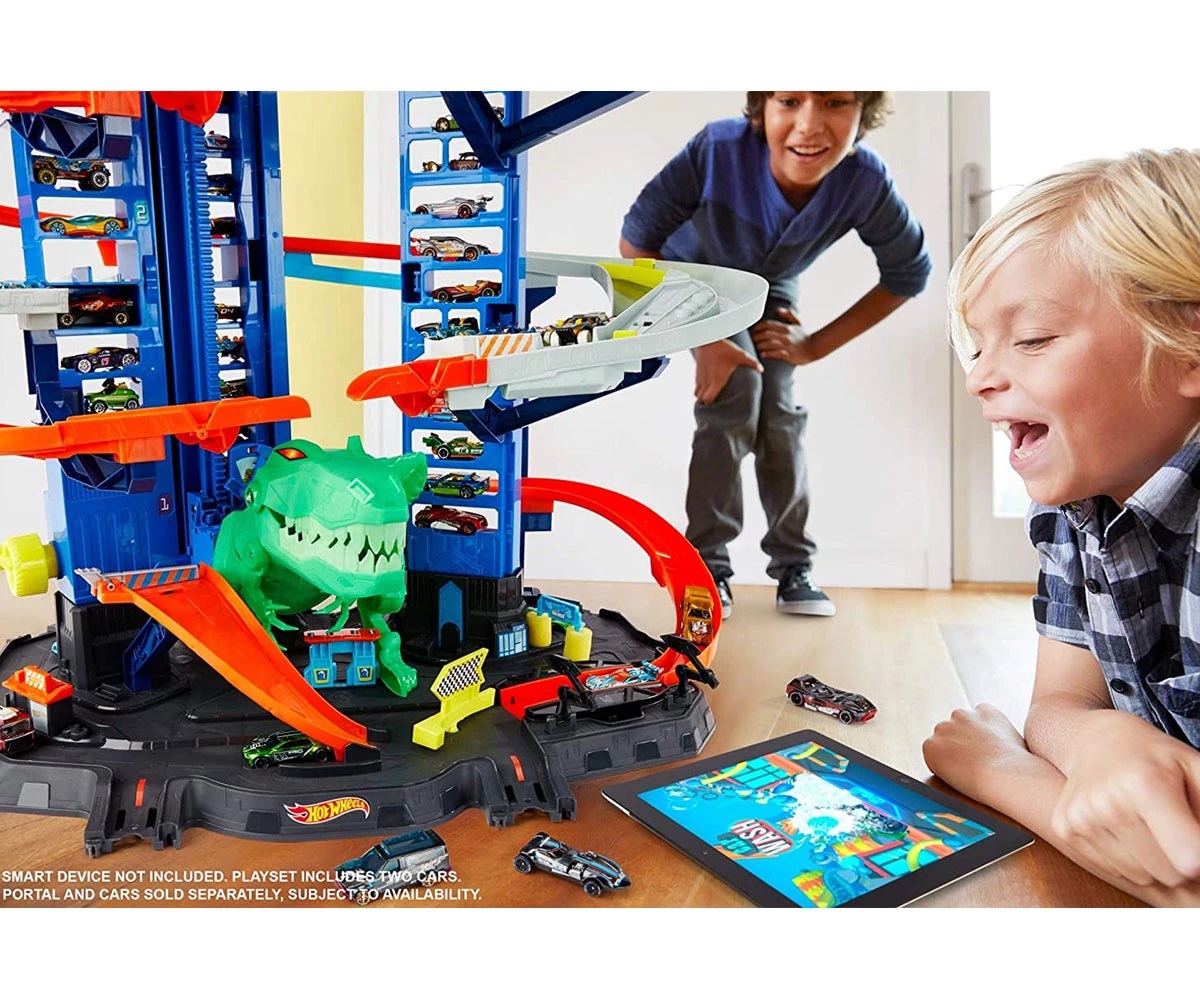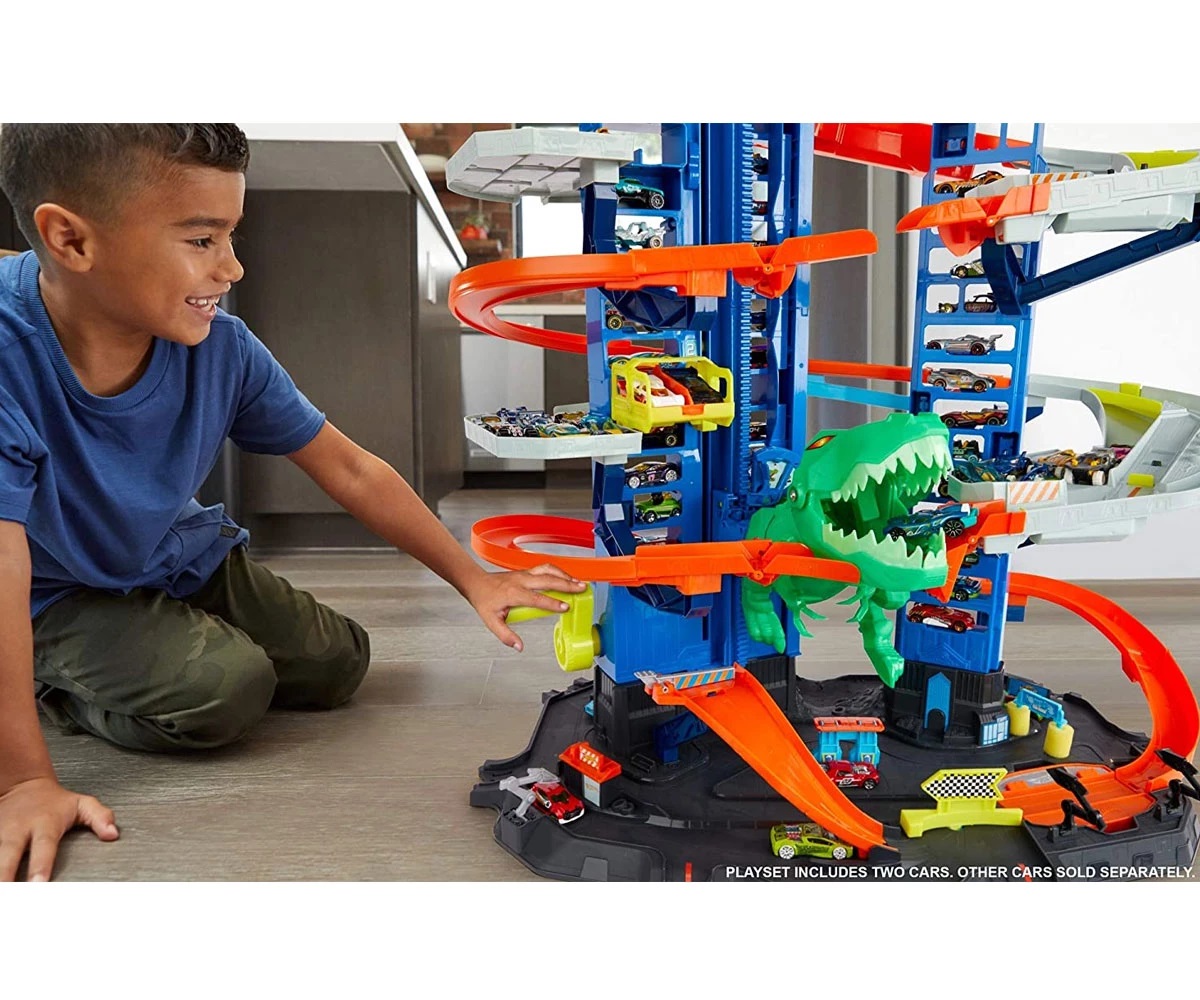 Този огромен комплект има паркинг за над 100 превозни средства и изненадващ Robo T-Rex враг, който подхранва въображението на децата!