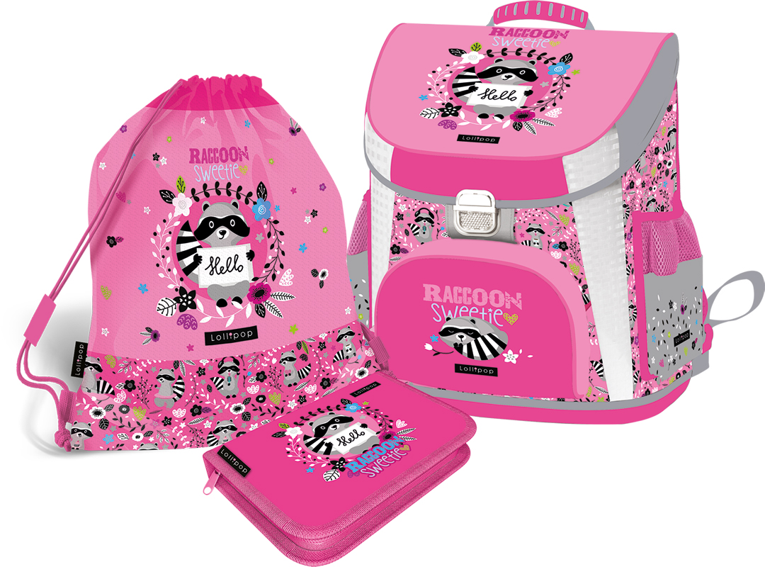 LizzyCard 2021 LOLLIPOP RACCOON SWEETIE Комплект 3 в 1 ергономична раница, несесер с 1 цип и спортна торба + ПОДАРЪК торба