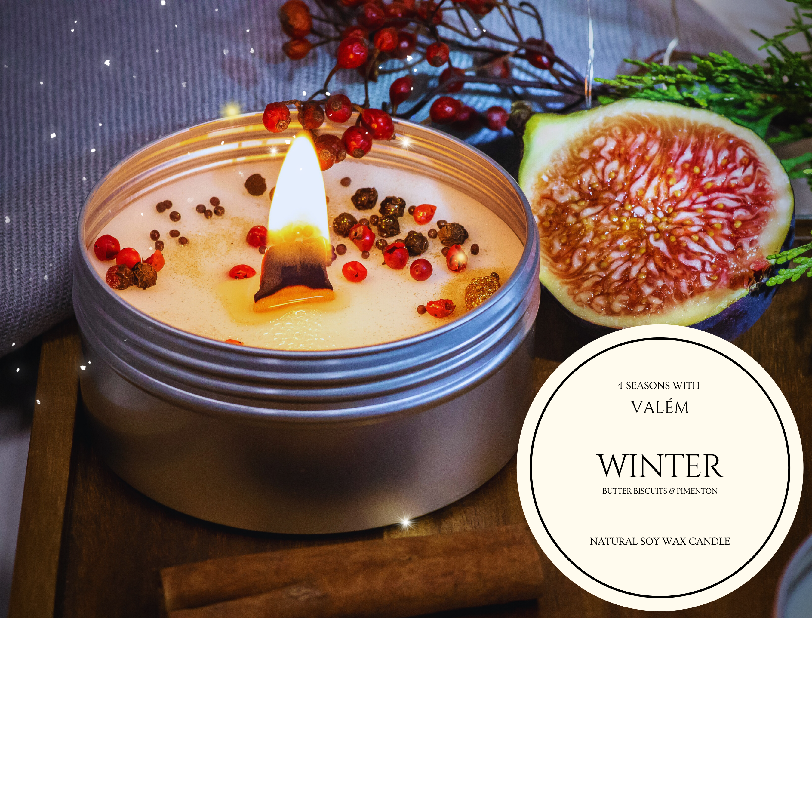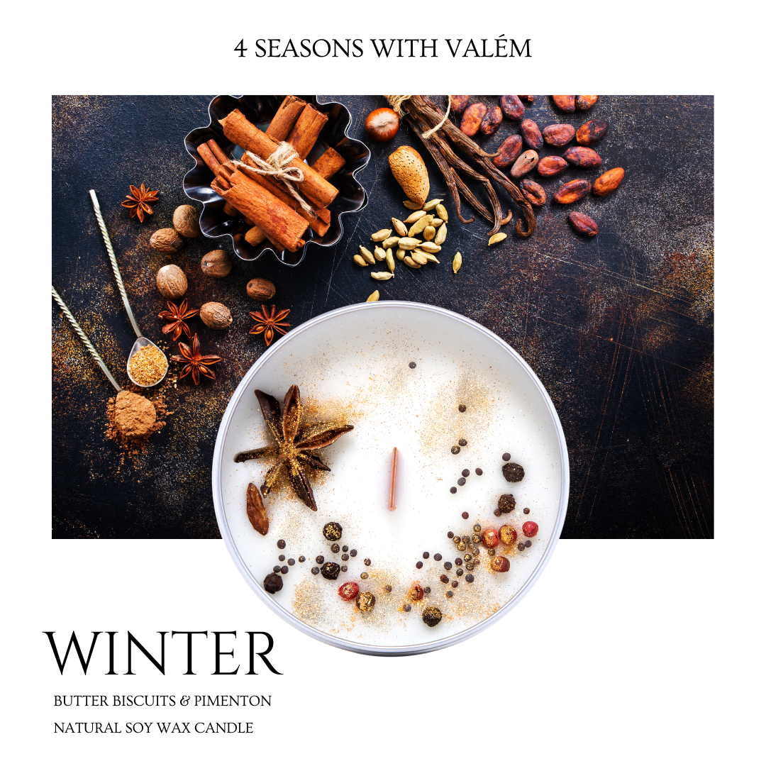 С натуралната свещ WINTER от колекцията 4 SEASONS WITH VALÉM ще се насладите на опияняващ звук от горящия дървен фитил и зимна наслада.