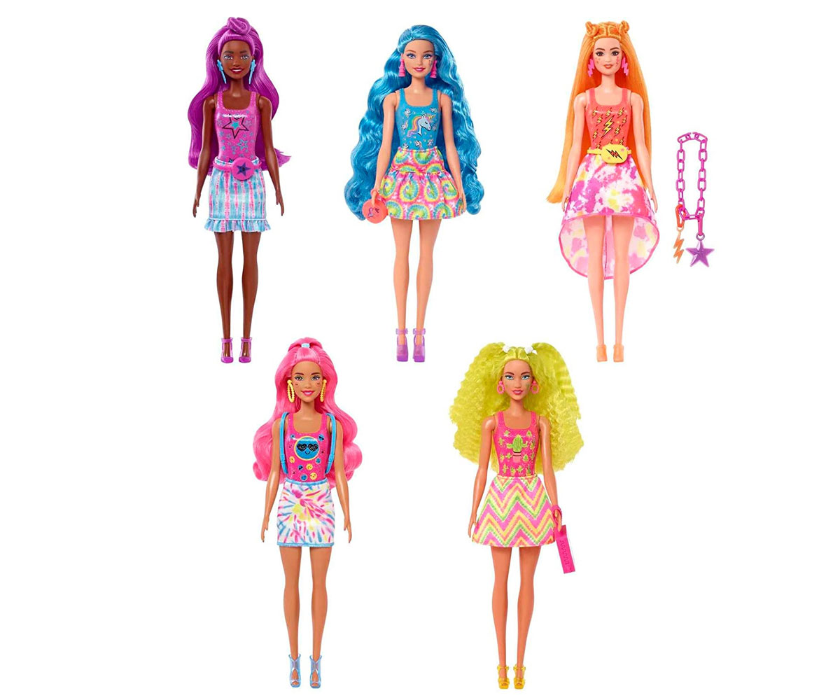 Всяка кукла Barbie® има дълга коса в неонов цвят със смел стил и цветен корсаж, но изненадите продължават...отворете пликчетата, за да откриете пола с щампа, чанта, чифт обеци, четка и обувки.