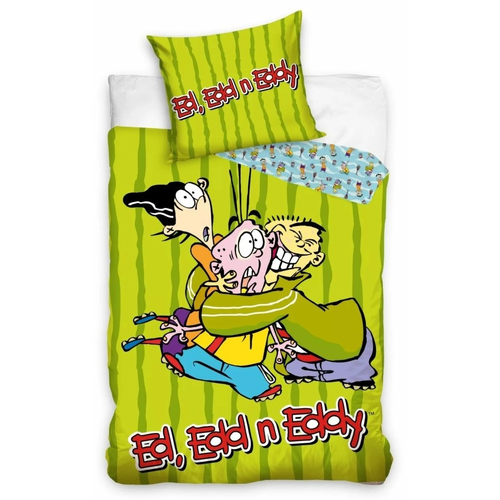 Любимите герои на вашето дете Ед, Едд и Еди от телевизионният сериал „Едс“. Любимата тв поредица може да бъде вече в стаята на всяко дете. Пликът е двулицев в различни десени. На лицевата страна са изобразени Ed, Edd n Eddy прегърнати, а от другата страна техни малко фигури на син фон. Спалният комплект е изработен от 100% памук, което гарантира мекота и дълготрайност. Лицензираният спален комплект е снабден с цип, който ще е в удобство на всяка майка.