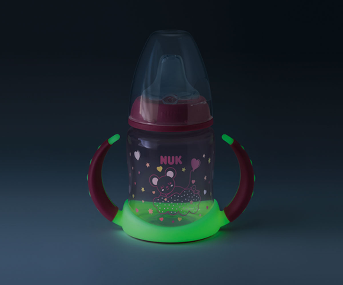 Бебешко шише за сок Nuk Glow in the Dark РР, 150 мл със силиконов накрайник, 6-18м, розово