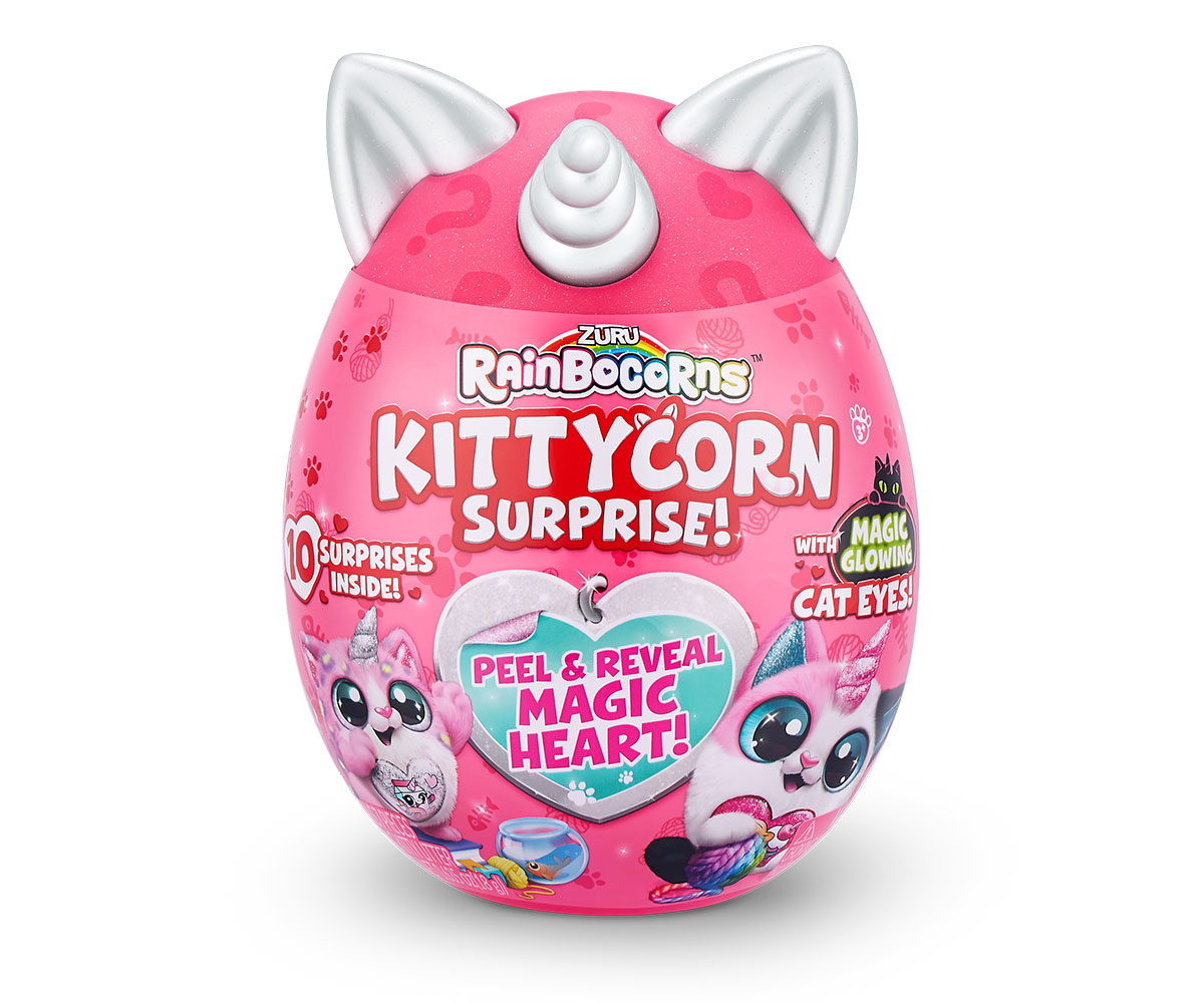 Малък рейнбоукорнс плюшено котенце с искрящо сърце, бял рог