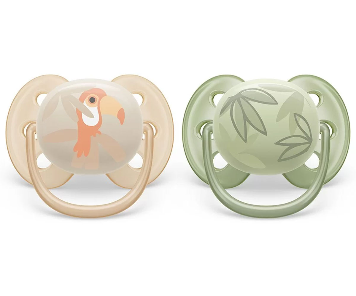 Ортодонтични залъгалки Philips-Avent Ultra Soft, 2 броя, със стерилизаторна кутия, тукан/листа, 0-6 м - Ref. 0799628