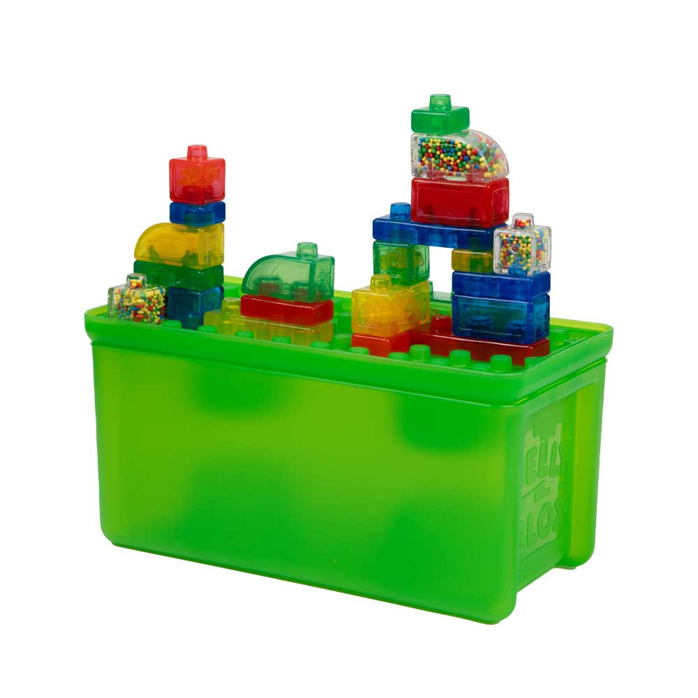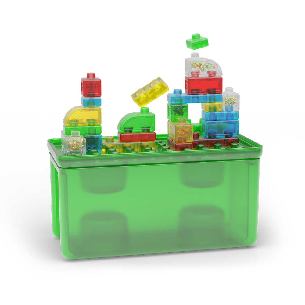 С блокчетата в кутията за съхранение Jelly Blox можеш не само да строиш, но и да ги стискаш и сплескваш. Някои блокчета са пълни с материали като пясък, кубчета или топчета от пяна, които стимулират сетивата и насърчават сетивната тактилност.