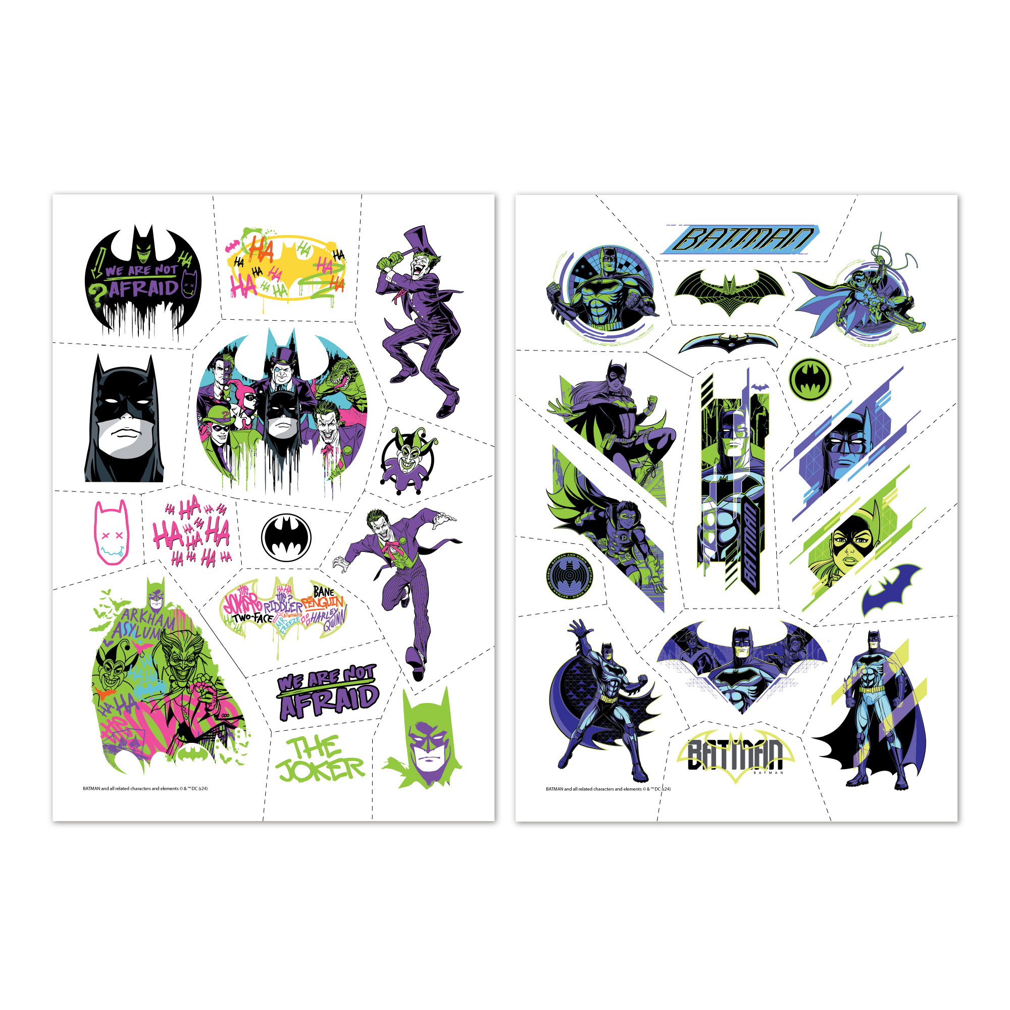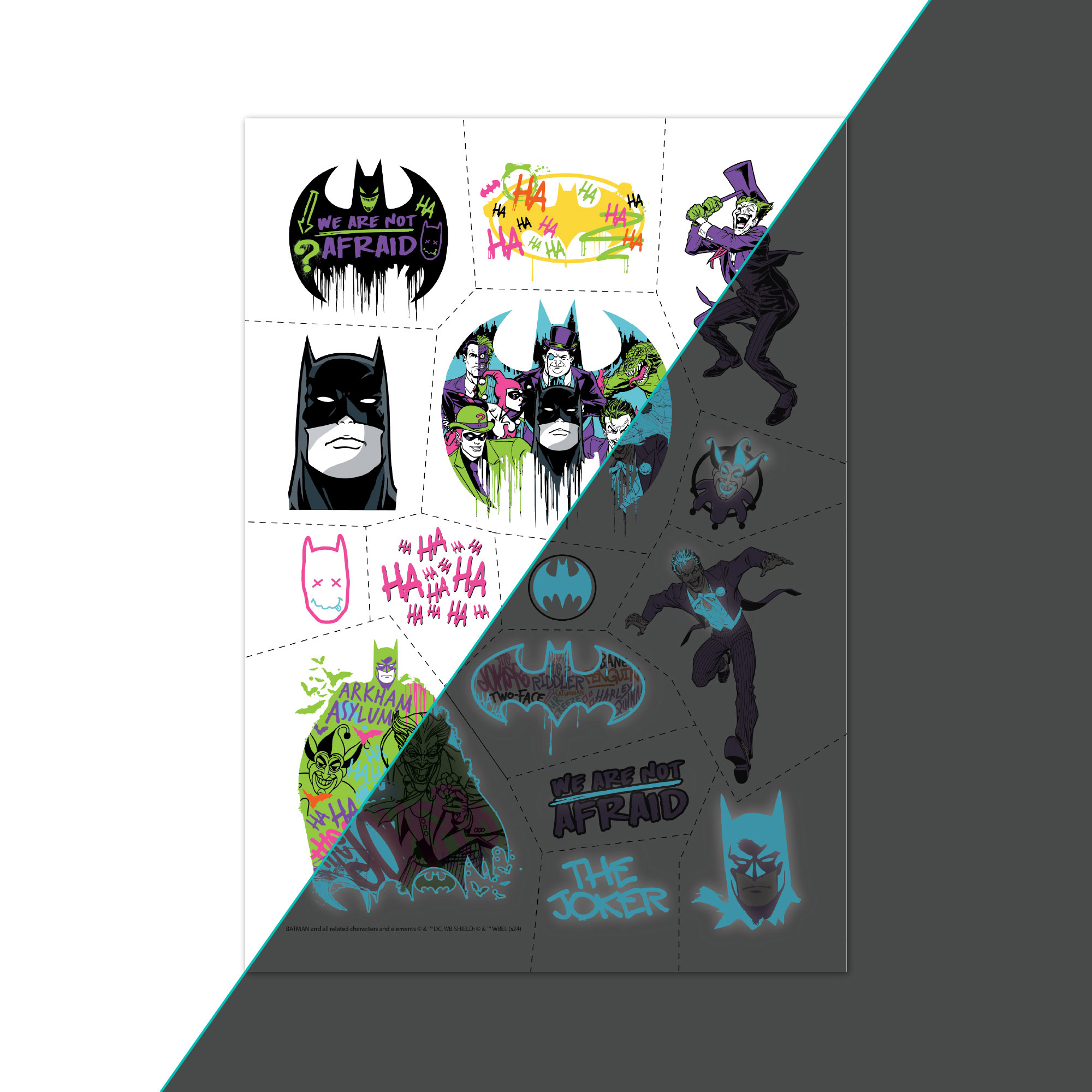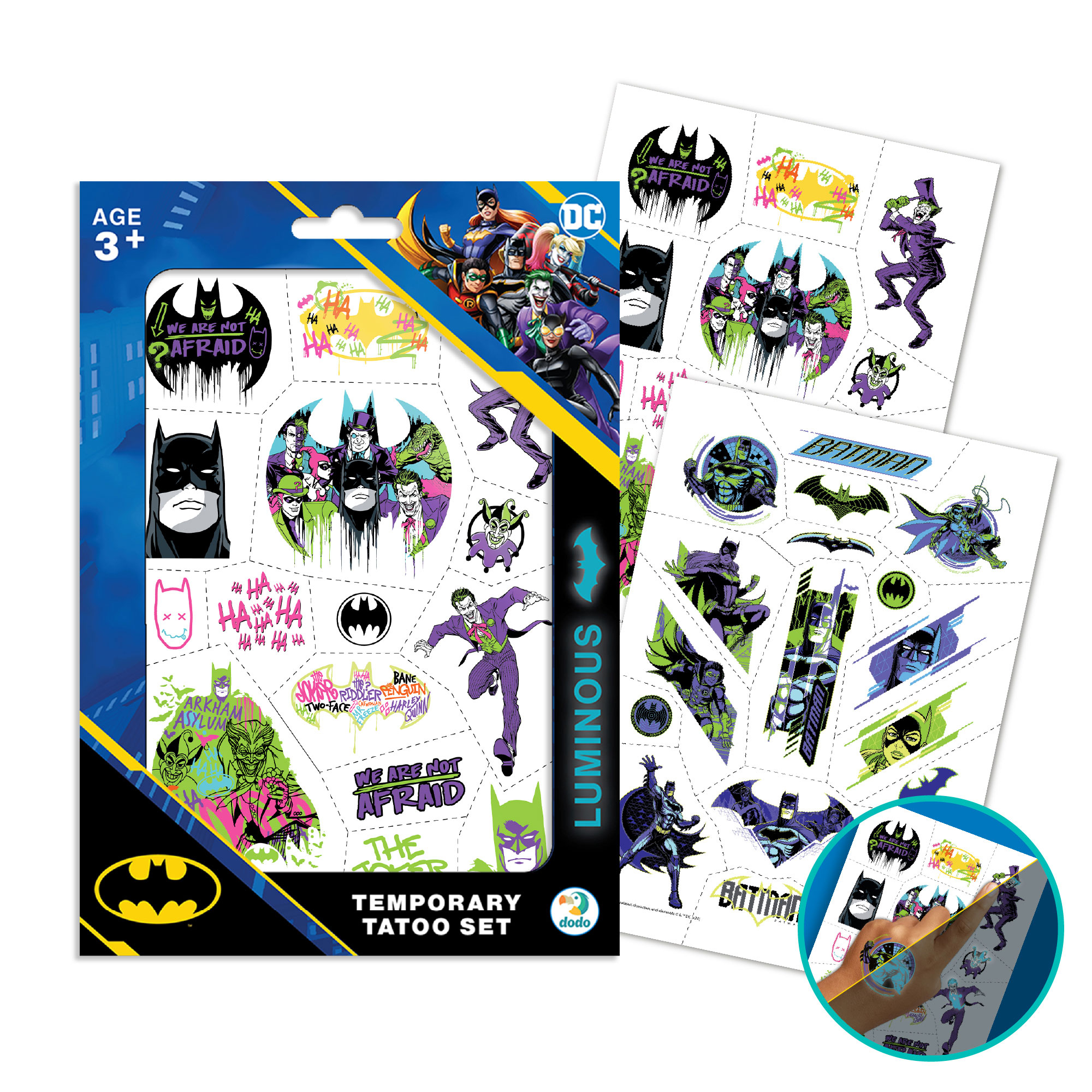 Потопи се в света на супергероите с този комплект цветни временни татуировки с мотиви от Batman! Подходящи за всички малки фенове на Човека-прилеп, татуировките са безопасни за кожата и лесни за поставяне и премахване. С четири различни листа, децата могат да изразят своя стил и любов към приключенията по забавен и креативен начин.