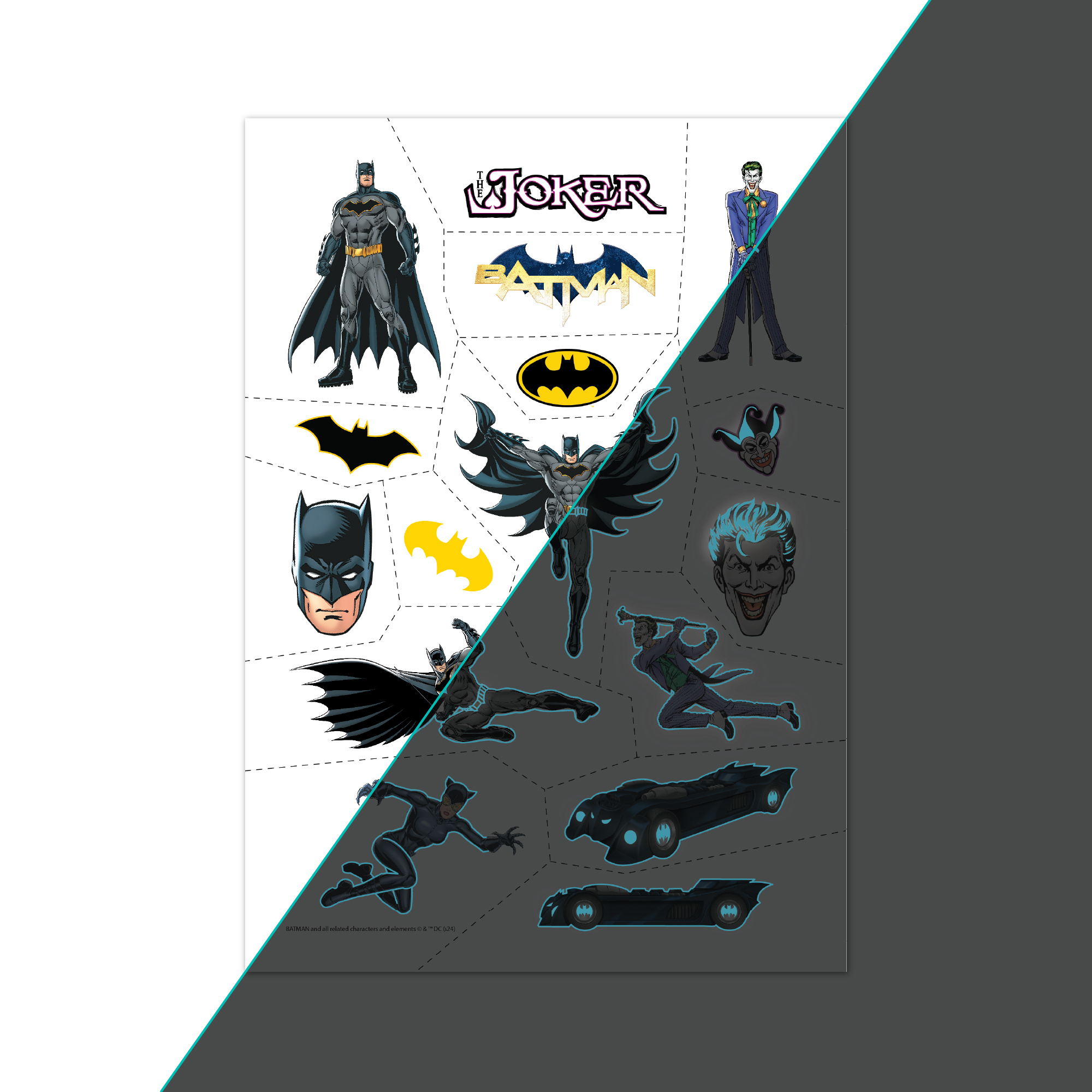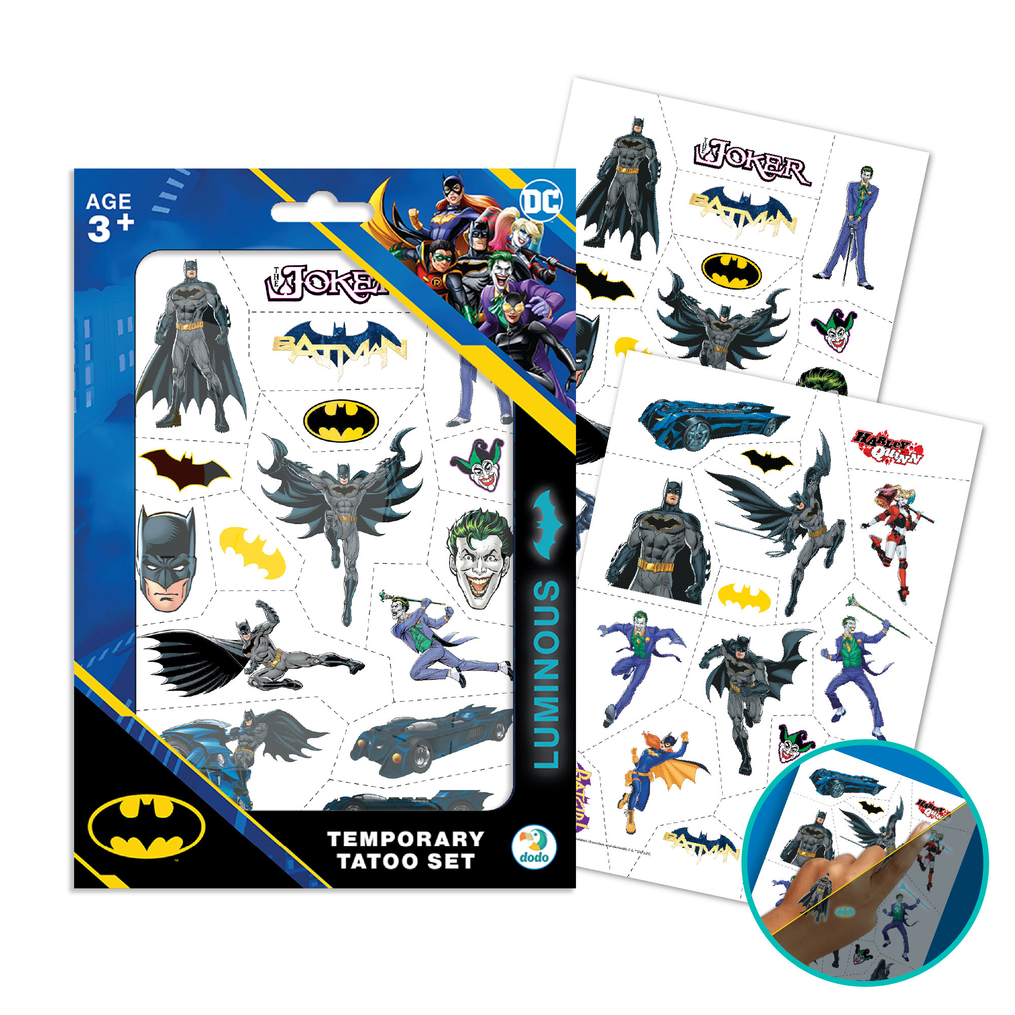 Комплект цветни временни татуировки с изображения на Батман – перфектен подарък за малки супергерои! Лесни за нанасяне и премахване, тези татуировки са чудесен начин децата да се забавляват безопасно и креативно.