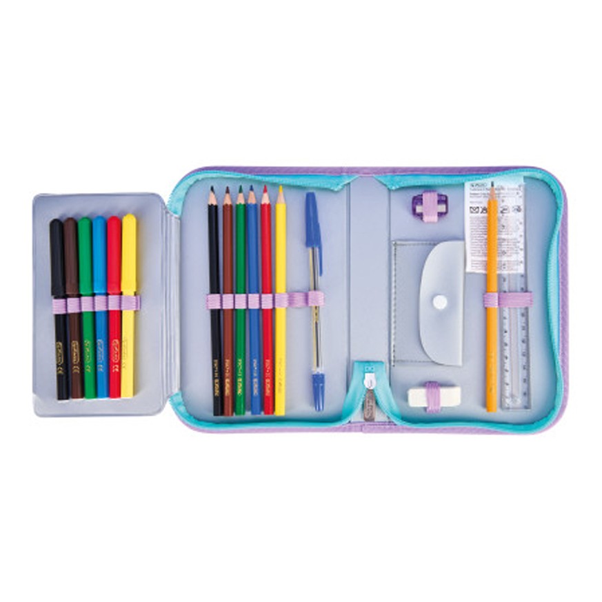 Пълен комплект – 19 части: цветни моливи, флумастери, линии, гумичка и острилка