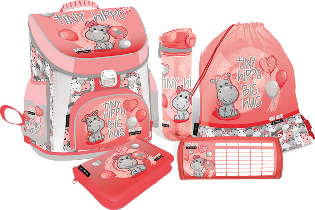 Със стилния ученически комплект 5 в 1 LOLLIPOP Thiny Hippo на Lizzy Card 2025 вашето дете ще има всичко необходимо за училище – ергономична раница Premium, несесер, спортна торба, бутилка и кутия за храна. Модерен дизайн, удобство и практичност – събрани в едно!