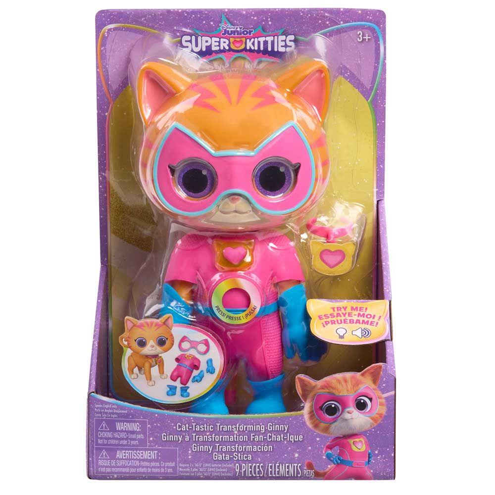 Трансформиращите се фигурки Super Kitties отвеждат забавлението на съвсем ново ниво! Натисни бутона и виж как сладкото коте мигновено се превръща в истински супергерой — със светлини, звуци и реплики от хитовия сериал на Disney Junior.