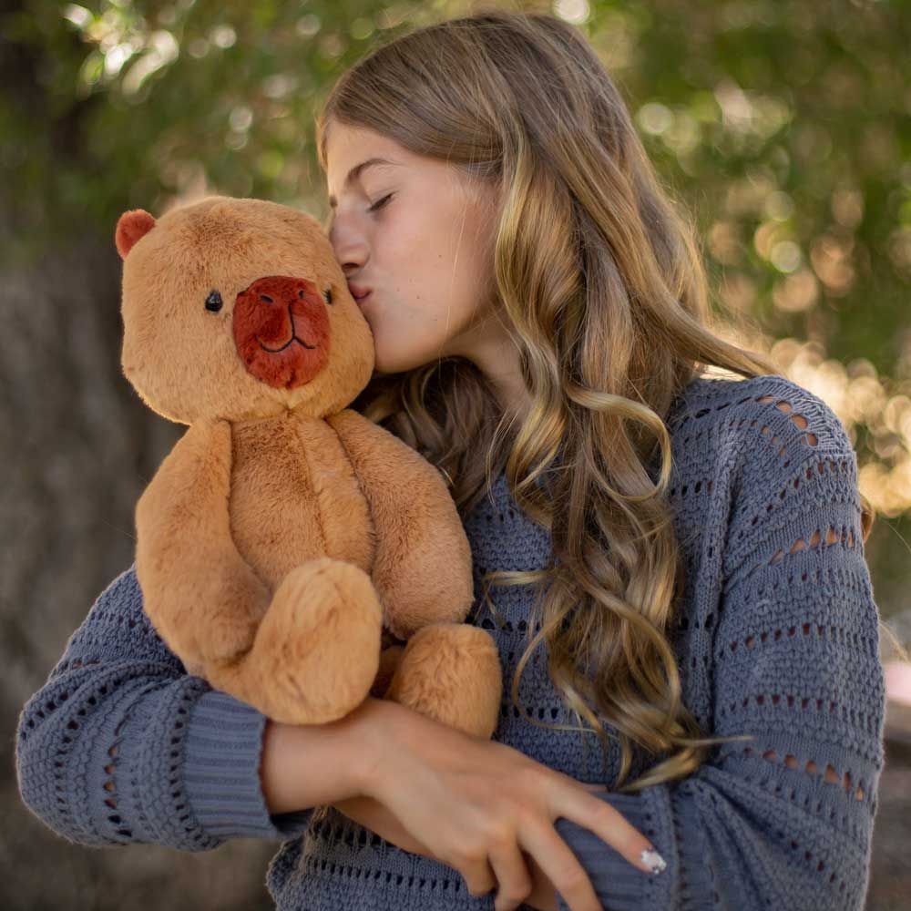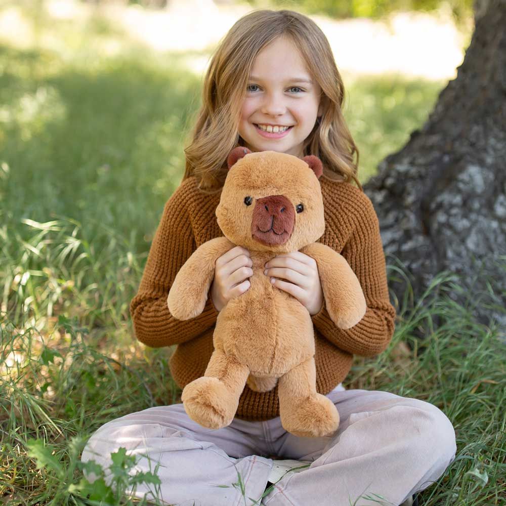 Тази сладка плюшена капибара носи уют, успокоение и много усмивки. Изработена от изключително мека материя, тя е идеален приятел за игра през деня и гушкане преди сън.