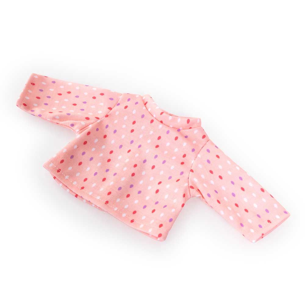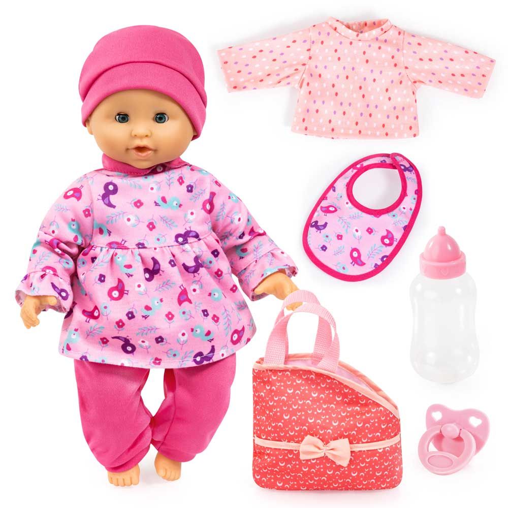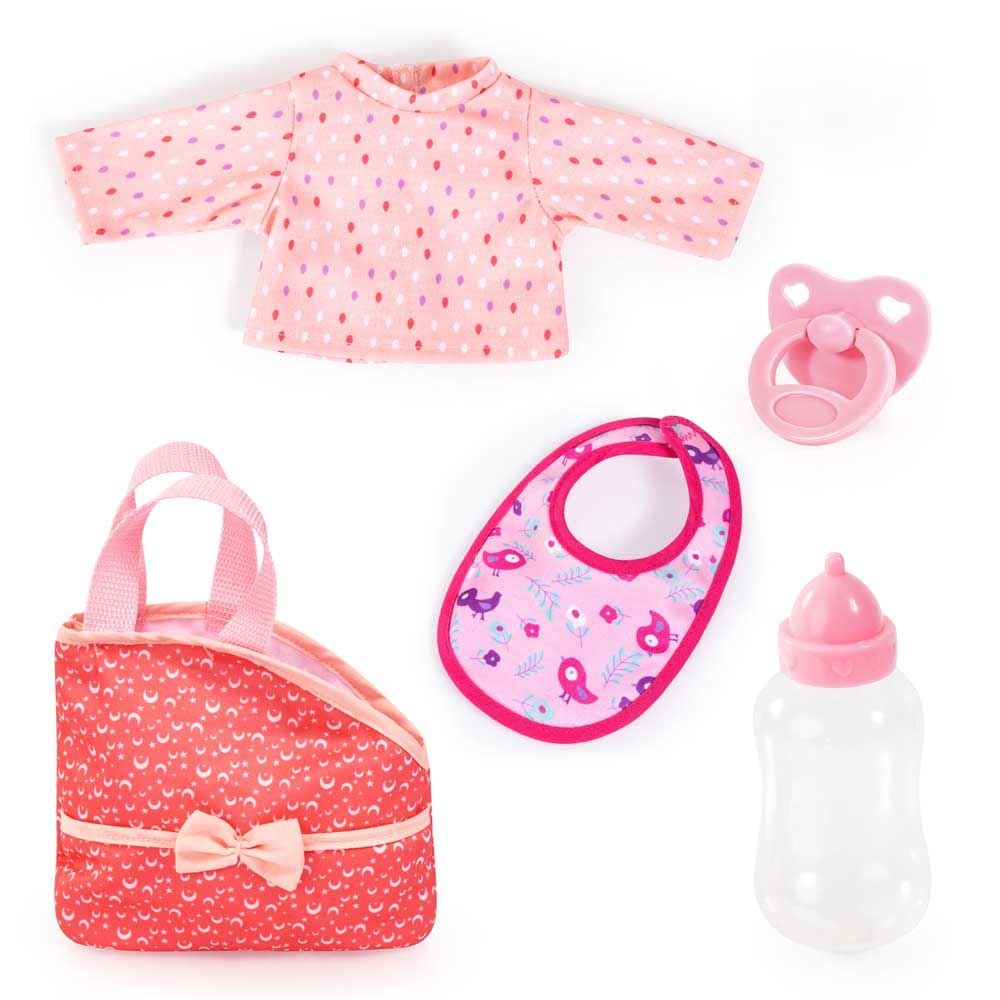 Куклата идва с цветни дрешки, шапка и панталони, а за още повече забавление е включена допълнителна дреха. С биберон, лигавник и залъгалка детето може да нахрани и утеши своята кукла, като развива грижовност и въображение. Идеална за ролеви игри у дома или за разходки, където куклата винаги е стилно облечена.