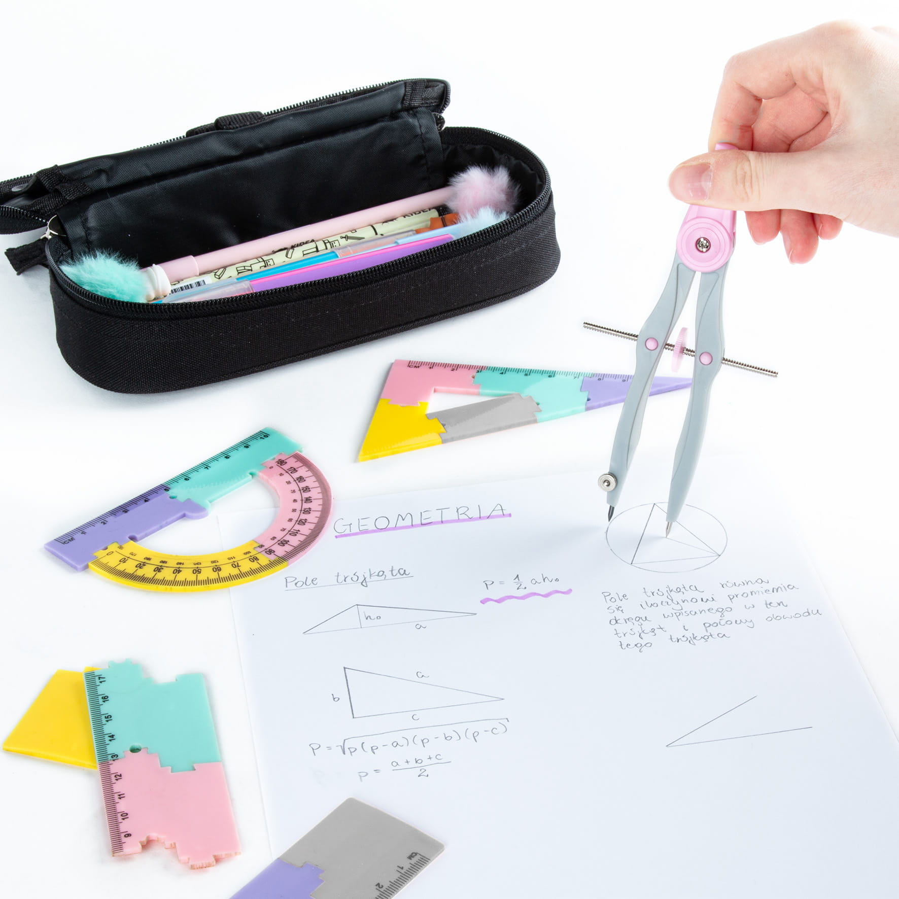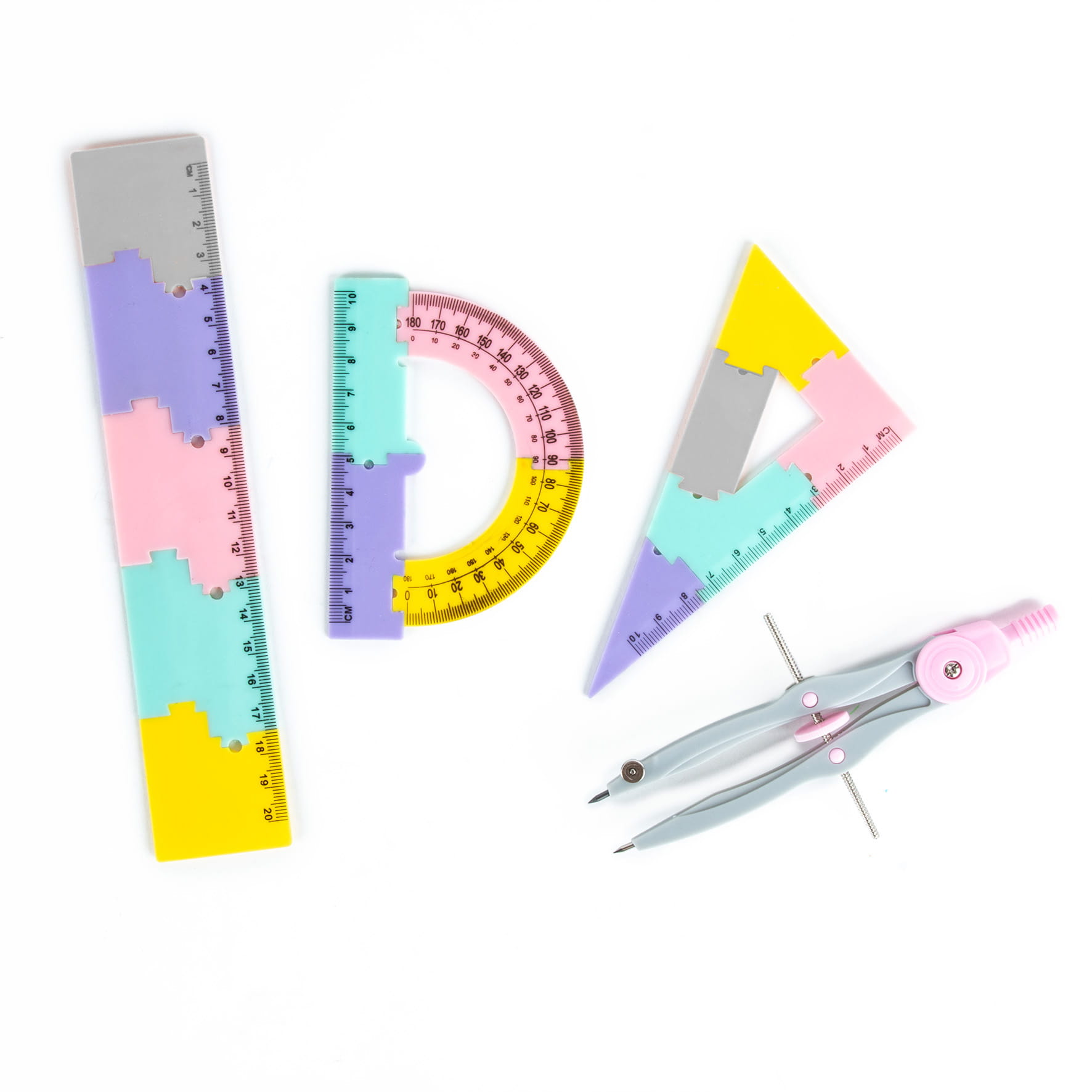 Практичен и стилен геометричен комплект в пастелни цветове, който съчетава функционалност и забавление. Подходящ за ученици и идеален помощник при изучаването на геометрия в часовете по математика. Елементите могат да се разглобяват и сглобяват отново като пъзел, което прави комплекта още по-интересен за използване.