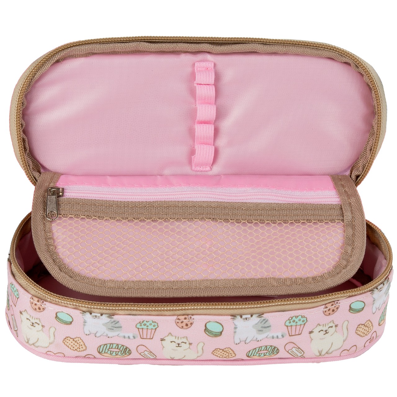 Овален несесер с едно отделение, изцяло подплатен и удобен за съхранение на ученически принадлежности.