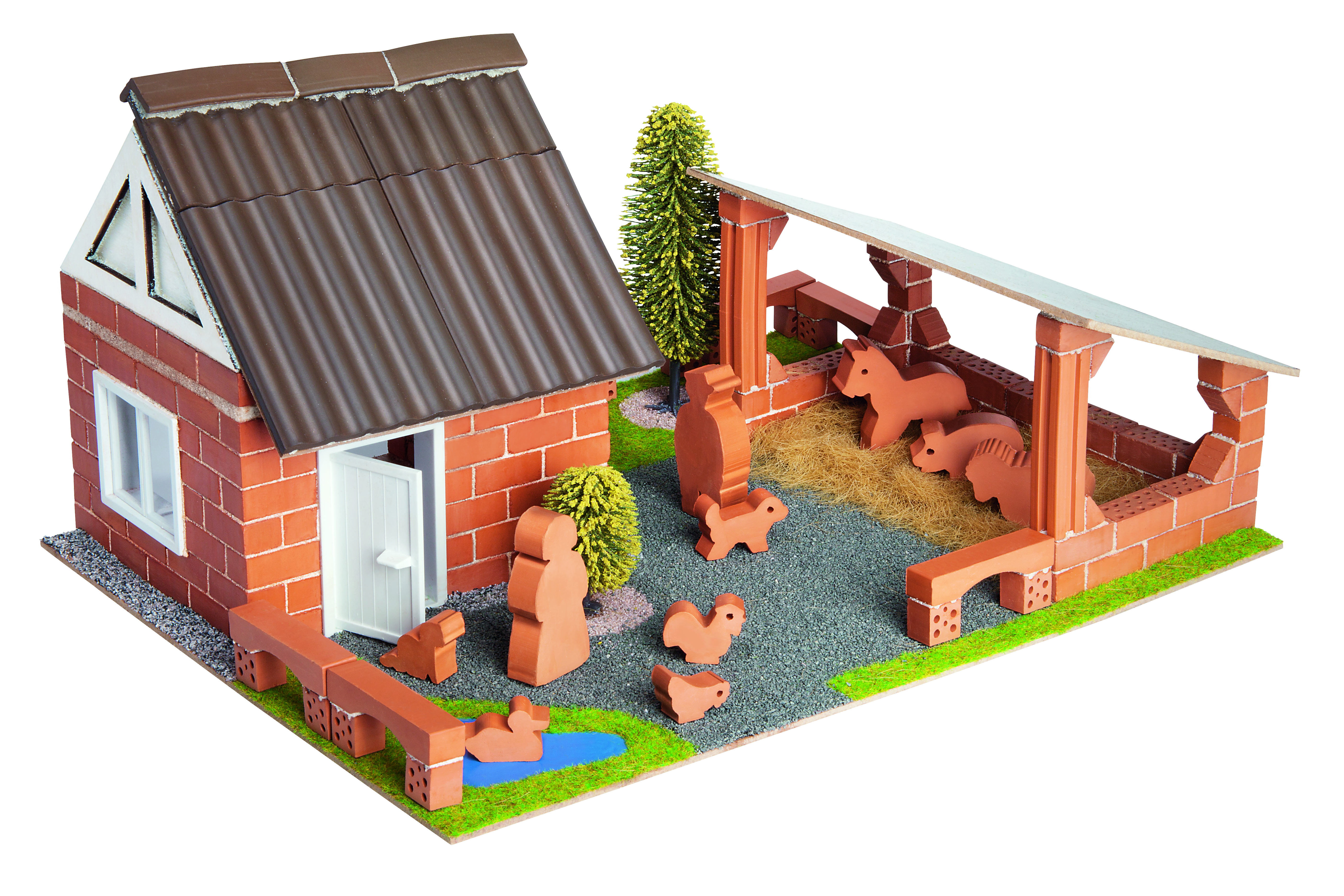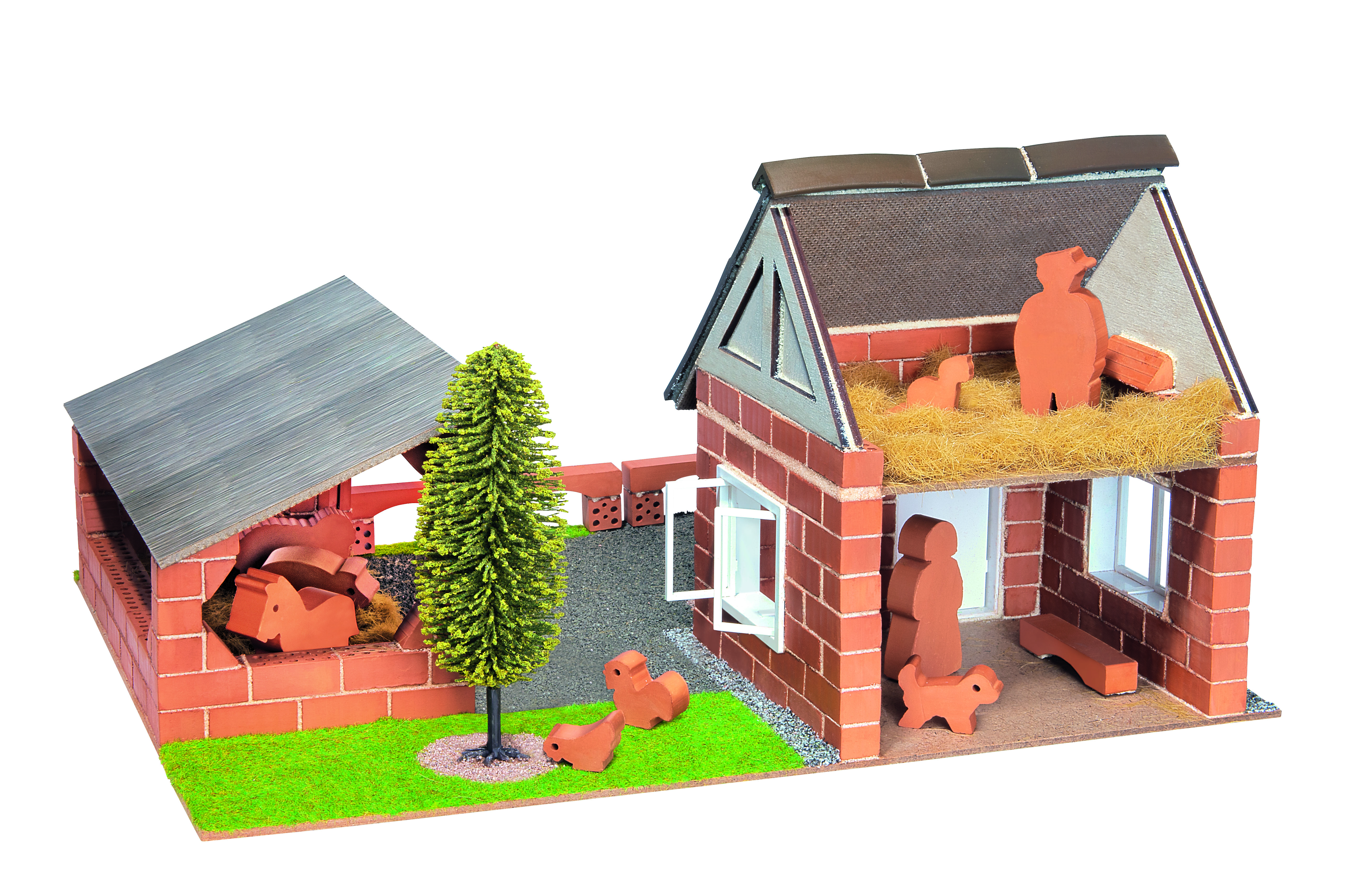 Комплектът включва истински тухлички за многократна употреба, инструменти, хоросан от безвреден пясък и царевичен екстракт, подробни инструкции, пластмасови врати и прозорци, 10 фигурки на животни и хора.